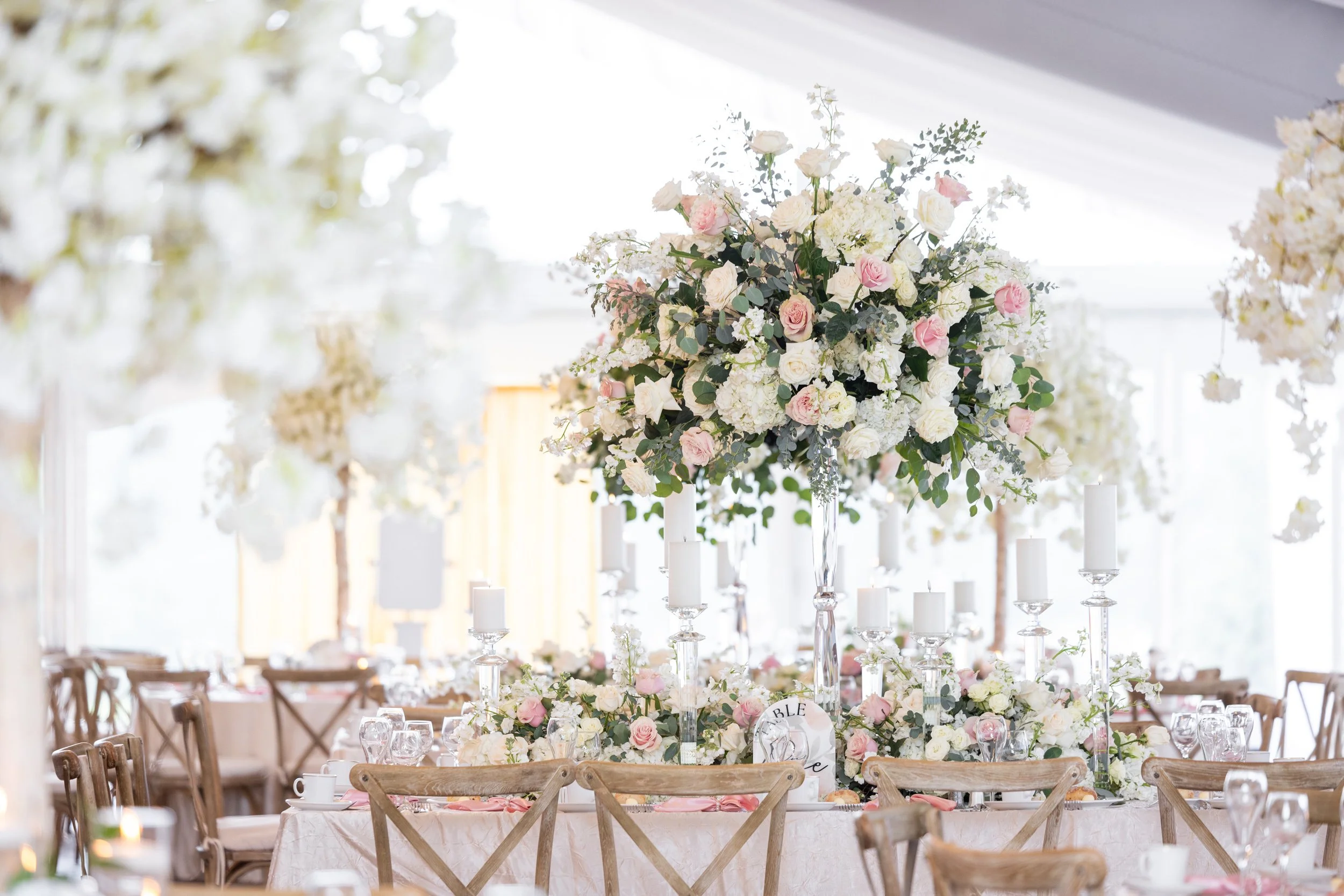 An atmosphere designed to be felt—layers of florals and candlelight set the tone for an unforgettable evening at Meadow Brook Hall.